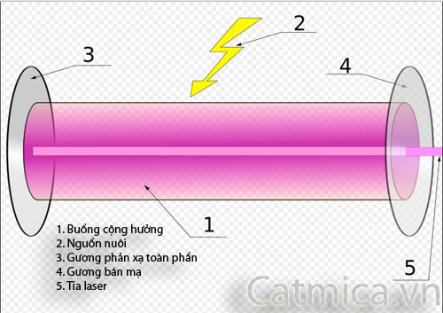 - Buồng cộng hưởng chưa một hoạt chất đặc biệt có khả năng khuếch tán ánh sáng bằng phản xạ cưỡng bức để có thể tạo ra laser. Khi 1 photon va chạm vào hoạt chất này thì sẽ kéo theo 1 photon khác bay cùng hướng với photon tối.