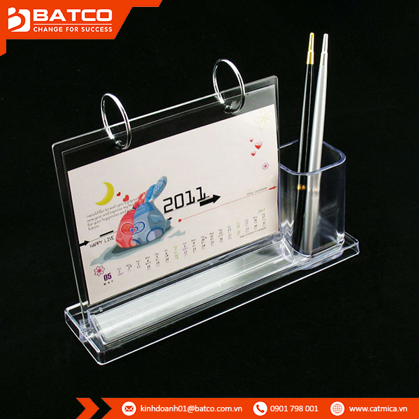 Mẫu đế lịch mica để bàn liền kệ đựng bút