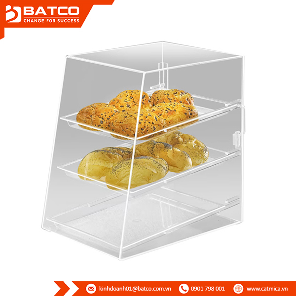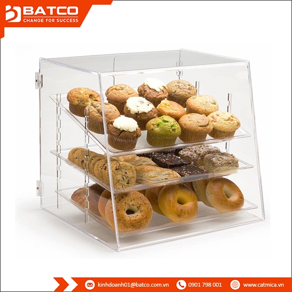 Hộp đựng bánh ngọt làm từ mica được dùng để đặt tại bàn, quầy bán hàng của các tiệm bánh để trưng bày và bảo quản các mẫu bánh.