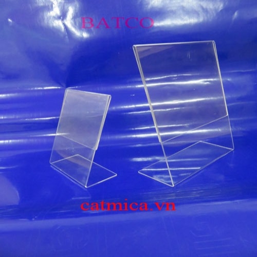 Kệ menu chữ L đứng thường được làm từ chất liệu mica trong suốt độ dày 2mm; 2,8mm và thiết kế khổ A5, A4 tùy theo yêu cầu của khách hàng.