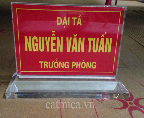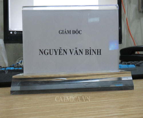 - Thiết kế đẹp mắt phần thân gồm miếng mica trong 2mm gập lại cố định trên đế 20mm được mài vát bằng keo chuyên dụng, phần thân để hở là 1mm để bạn nhét giấy in tên chức danh ngoài ra còn giúp bạn thuận tiện cho việc thay đổi nội dung biển.